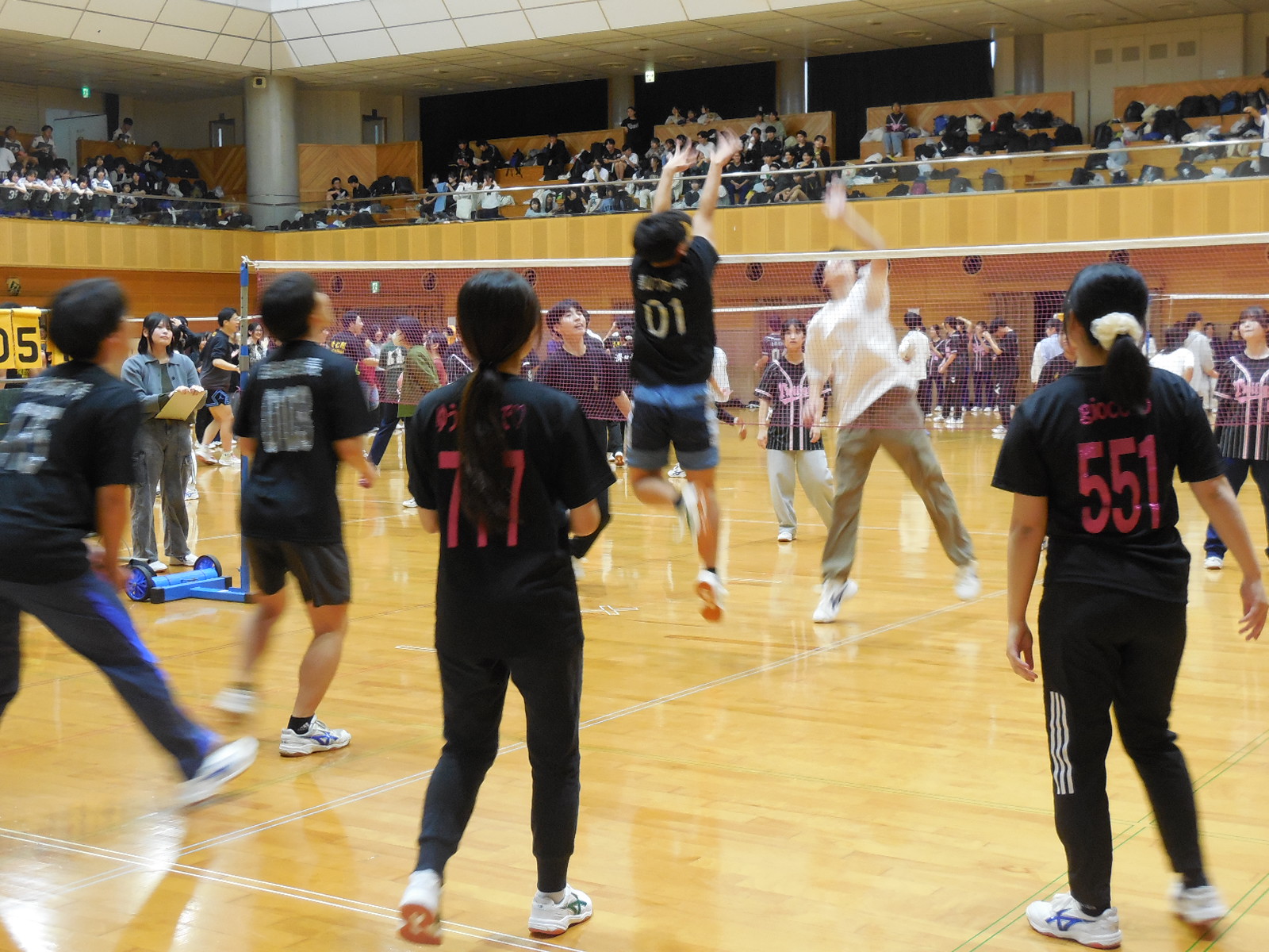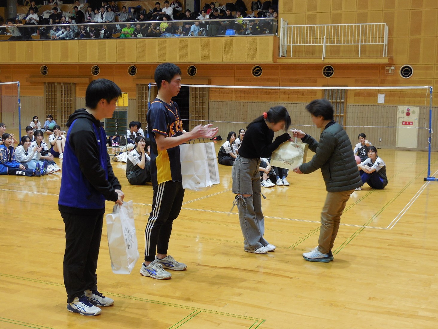 小雨が降る中、午前8時30分に熊本電鉄車庫に集合して、午前9時に出発し、午前10時にあんずの丘の体育館に到着しました。旧生徒会やバレーボール部の生徒をはじめとする有志の皆さんでネットを設置し、ミニバレーボール(ルールはバレーボール)のクラスマッチがスタート、正午頃まで熱戦を繰り広げました。優勝は10組Aチームで、2位が6組Cチーム、3位が8組Bチームでした。表彰式後、地元出身の生徒の御親族の方から頂いたジュースをみんなでおいしく飲みました。御親族様には、この場を借りて厚くお礼を申し上げます。
