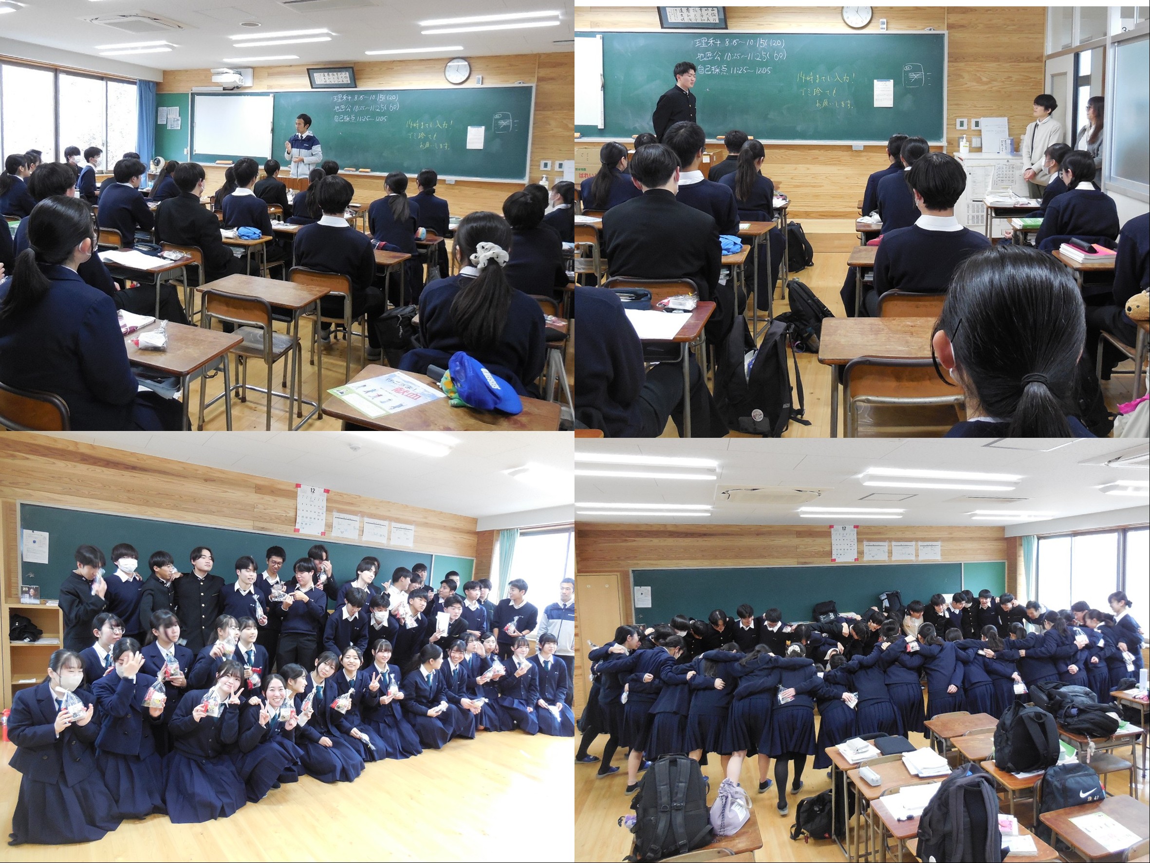 今年最後のプレテストの自己採点終了後に、3年の各クラスにおいて、同心会の保護者の方々から、緊張をほぐすキーホルダーや元気を与えるお菓子が手渡しされ、励ましのお言葉も頂きました。担任の先生からは、ねぎらいの言葉とアドバイスが送られました。それに対して、生徒代表がお礼と決意を述べました。クラスによっては、その後、記念写真を撮ったり、円陣を組んで鼓舞したりしました