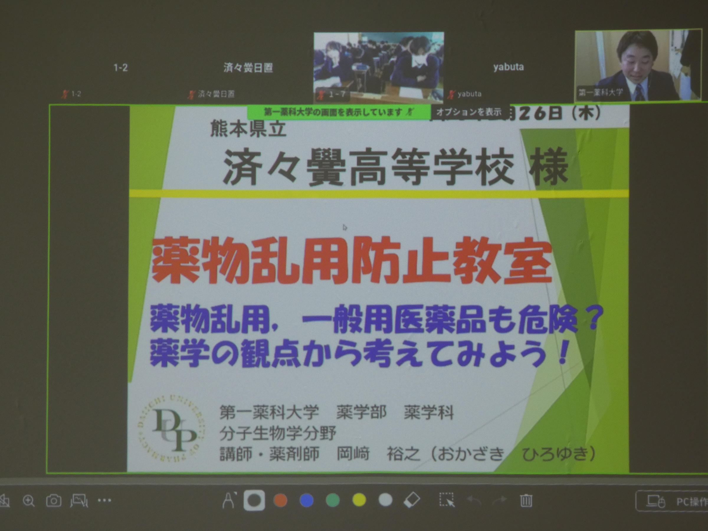 2月26日(木)7限目のLHRの時間に、済々黌OBで第一薬科大学の岡﨑裕之様を講師にお迎えし、「薬物乱用防止教室 薬物乱用,一般用医薬品も危険?薬学の観点から考えてみよう!」と題して、オンラインによるライブ配信講話を実施しました。