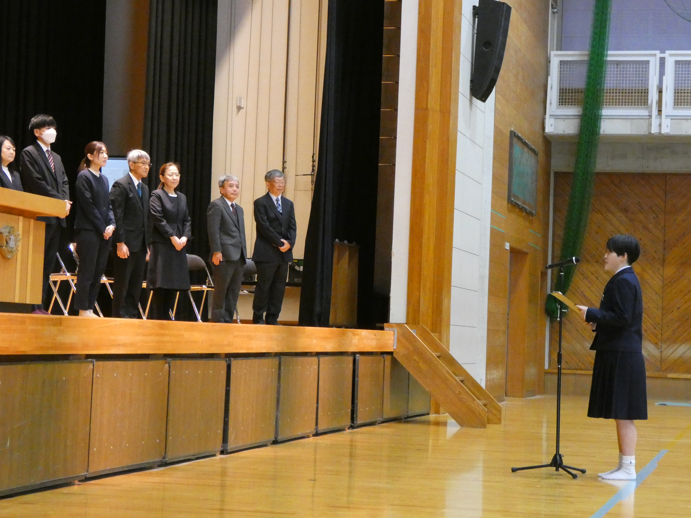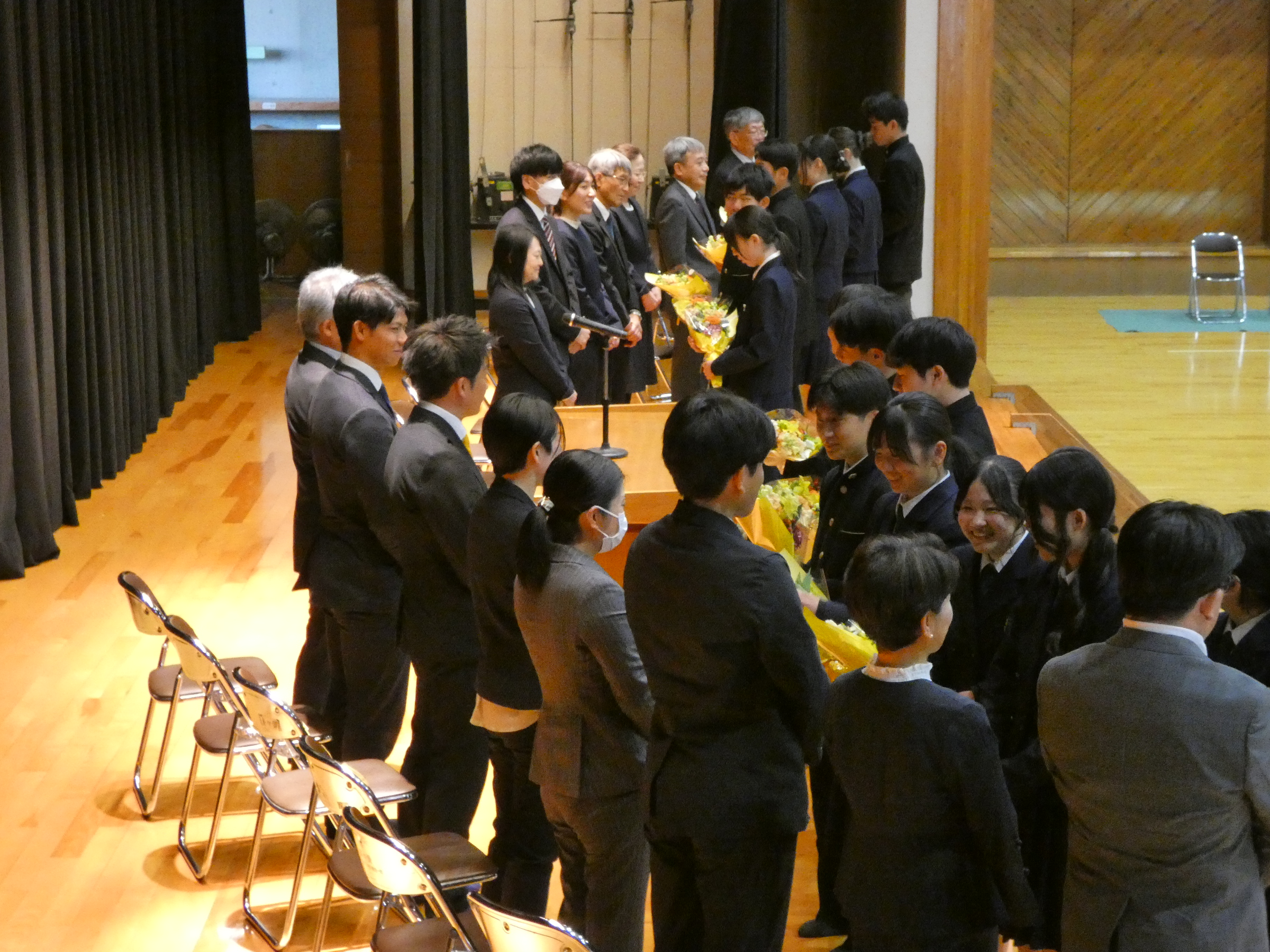 在校生と卒業生、職員が体育館に集まり、本黌を去られる先生方から最後のご挨拶をいただき、お一人おひとりから、これまでの思い出や生徒達への励ましの言葉が語られました。それから、生徒代表より感謝の気持ちが伝えられました。
