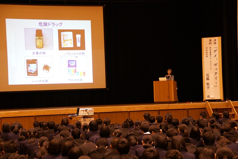 2月20日(火)、学校薬剤師の近藤敦子様と、熊本県警スクールサポーターの山口幸一郎様、水上季春様を講師にお迎えし、1年生を対象とした薬物乱用防止講話が開かれました。