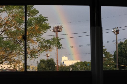 ある秋の日の放課後、プレハブ校舎から大きな虹が見えました。