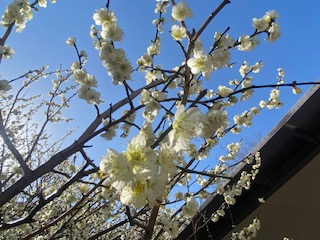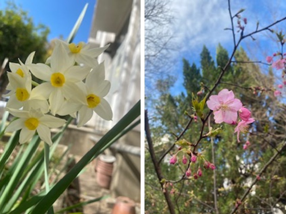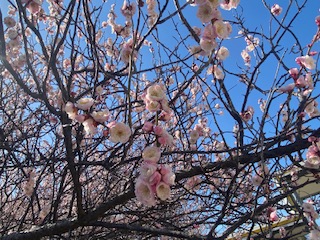 梅や桃、河津桜の蕾が次々と開き、澄んだ青空にかわいい飾りつけをしてくれています。