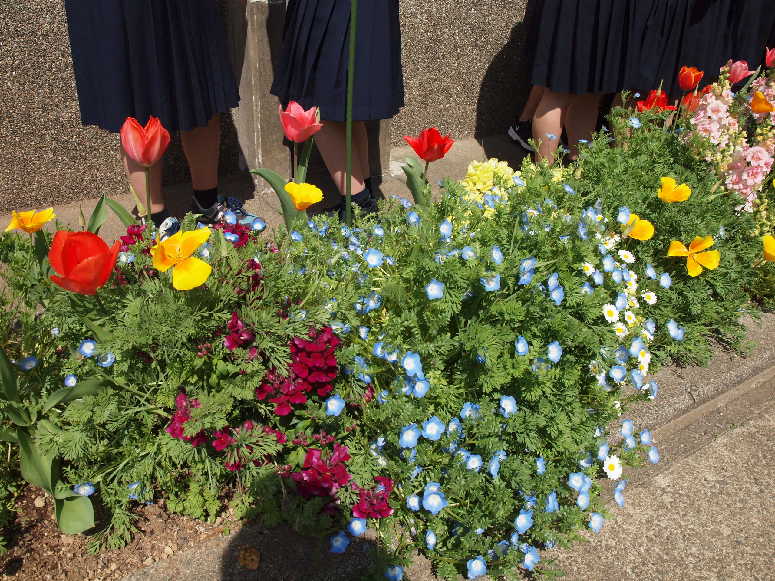 あたたかな日が続き、毎日散歩するのが楽しい季節となりました。花壇はたくさんの花で溢れています。環境美化委員が毎日手入れをしてくれたおかげで、チューリップの球根が立派に成長しました。色とりどりのキンギョソウが生徒たちのお気に入り。「金魚みたいで可愛い」と大人気です。合格発表も無事に終わりました。新一年生の入学を綺麗な花々もお待ちしています。 (写真・文/早瀨・永田)
