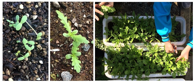 肌寒くなってからようやく発芽した春菊。本葉は小さいながらも縁がギザギザしていて、一人前に春菊であることを主張していました。害虫被害を特に受けることもなく、一度切り取って収穫しても脇芽を伸ばしてまた収穫できる、初心者でも安心して楽しめる野菜でした。