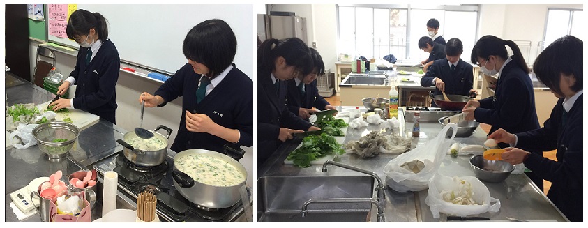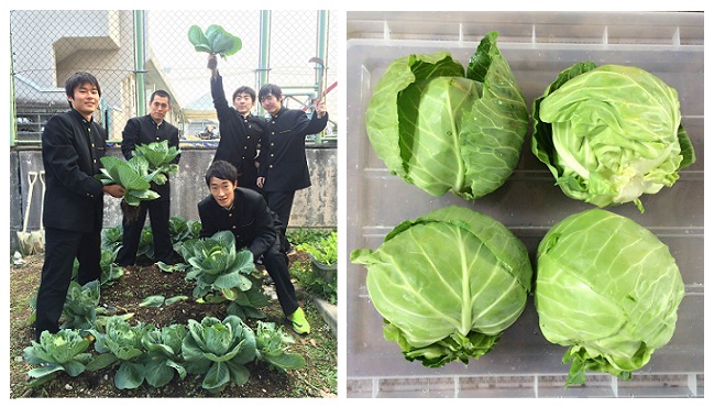 一連の取り組みを応援してくださる花の業者さんから苗をいただき、予定外にも栽培することになりました。栽培中は、苗に話しかけるとよく育つ等の知識を出し合ったり、青虫を殺さずに取り除く男子生徒諸君の姿に心が和んだものです。日当たりのいいプール横に畝を作り、青虫と日々格闘すること約2か月。まだ小ぶりですが、柔らかい葉がしっかり巻かれたものを収穫することができました。
