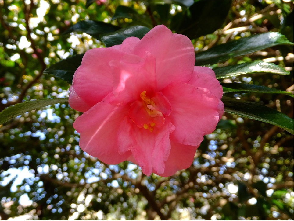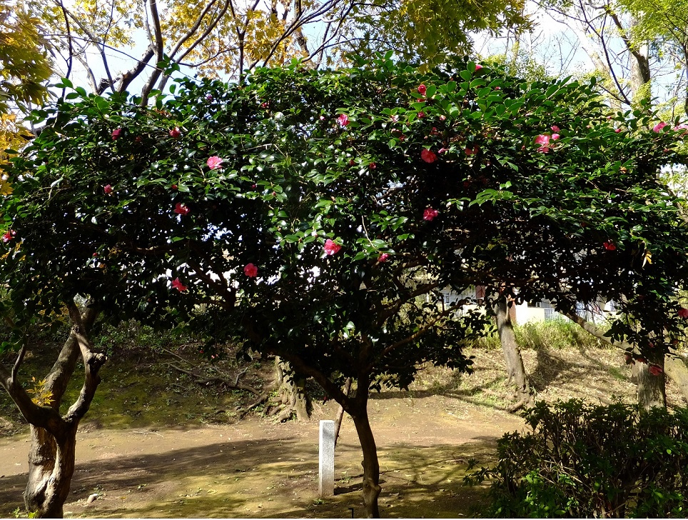 同心学舎前に咲いています。開花時期は10月初旬から2月初旬にかけて。花の少ない秋から冬にかけて咲き始めるので目を引きます。日本が原産地で、学名も英名もサザンカ (Sasanqua)です。