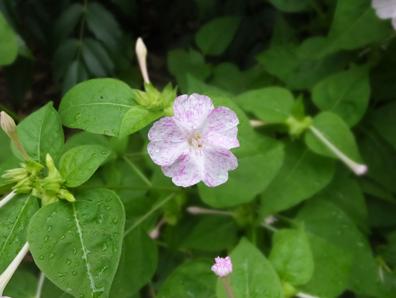 昇降口横に咲いています。単色のものが多いのですが、これはピンクと白の混色です。6月下旬から10月下旬までが開花時期のようです。タネをつぶすと白粉(おしろい)のような粉が出てくることからこの名前がつきました。子供の時に「パラシュート」をして遊んだ人も多いのではないでしょうか。