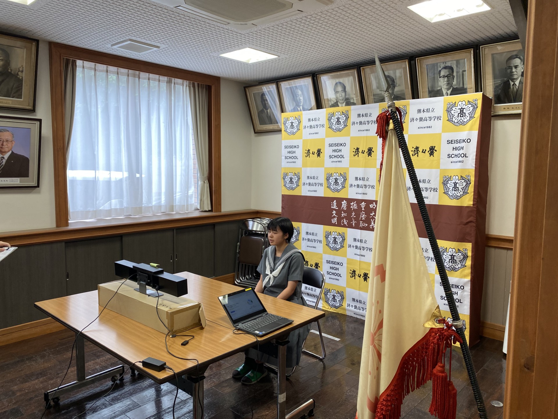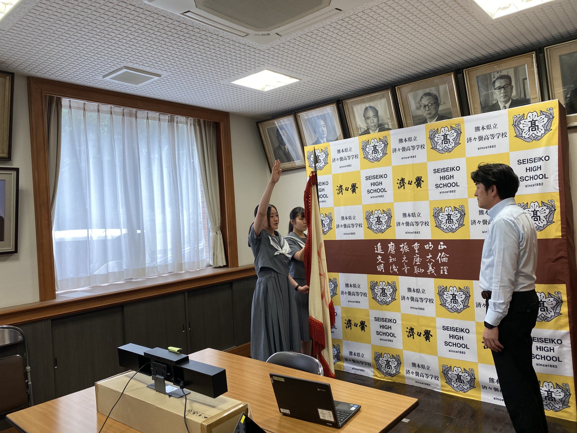 5月24日(金)に、高校総体・総文祭の推戴式が行われました。インフルエンザ等感染症予防のため、オンラインでの実施となりましたが、各部活動の主将や部長の生徒たちが、大会への決意を熱く語ってくれました。この大会のために、多くの時間を費やしてきたことでしょう。良い結果が出るよう応援しています。頑張れ済々黌生!!