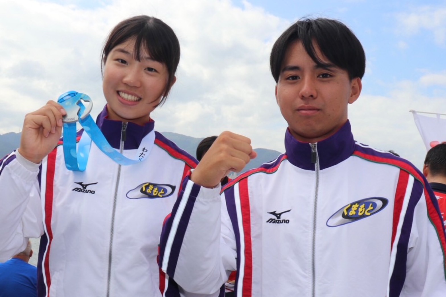 令和7年10月1日~10月8日、滋賀県立琵琶湖漕艇場で開催された第79回国民スポーツ大会に、本校漕艇部の上村羽愛子さん(3年)と坂本瑞來くん(3年)が熊本県選抜として出場し、上村さんが少年女子ダブルスカルで準優勝、坂本くんが少年男子舵手4つきクォドルプルで4位入賞を果たしました。全国トップの選手が集まる中、見事な成績を収め、学校中が盛り上がりました!