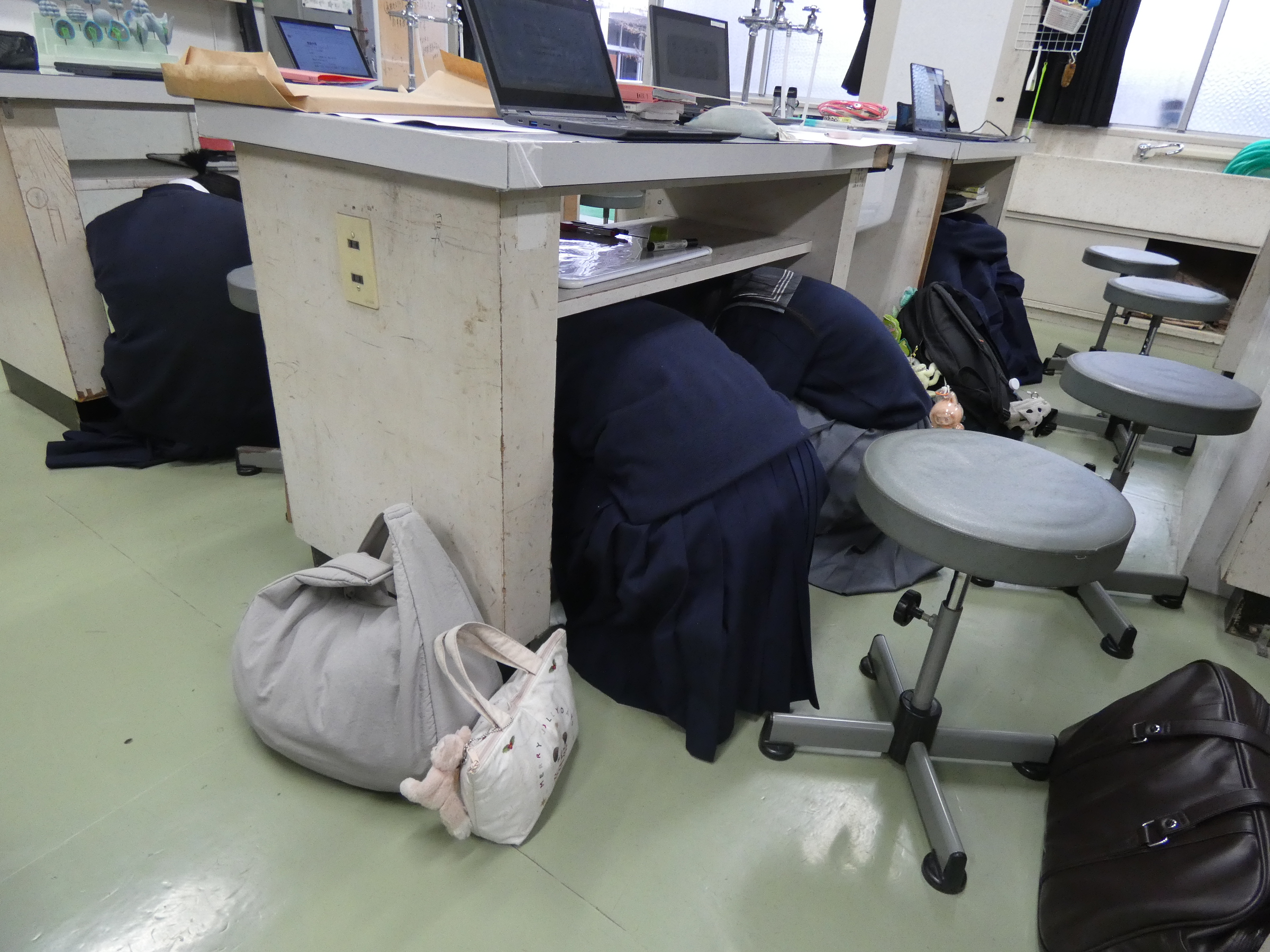 11月13日(木)、7限終了時から防災避難訓練が実施された。未明からの 降雨によりグラウンドが使用不可となり、急遽シェイクアウト訓練に変更とな った。緊急地震速報が発せられ、全生徒および職員が丈夫な物(机下)に身を 隠し、揺れがおさまるのを待った。 その後、校長および消防署の方から防災時に注意する事項などの説明があっ た。毎年発生する豪雨災害、周期的に発生する大地震などを経験している生徒 達は、真剣な眼差しで訓練に取り組んでいた。