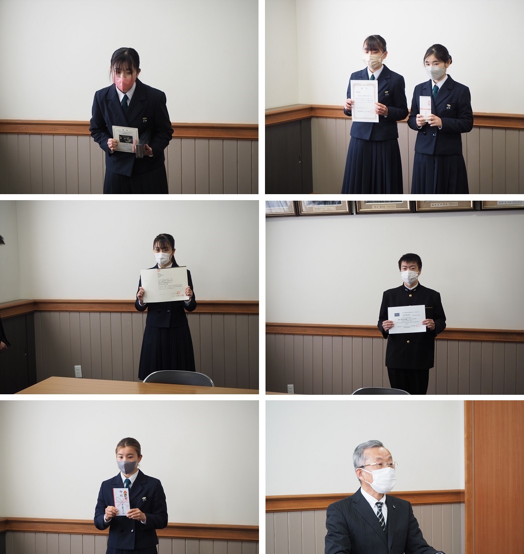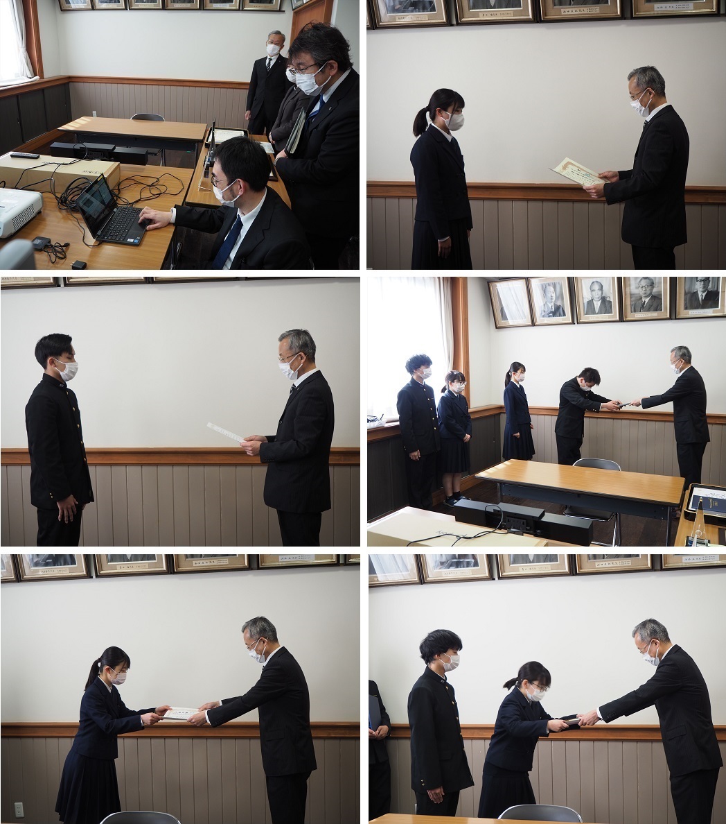 穏やかな春の陽ざしがが降りそそぐ中、令和3年度3学期終業式を行いました。大掃除で校内をきれいにしたあと、はじめに表彰式の様子をオンラインにて各教室に配信しました。表彰式では漕艇部や柔道同好会、生物部、地学部、化学部、吹奏楽部、写真部、美術部等の約40名の生徒達が表彰されました。