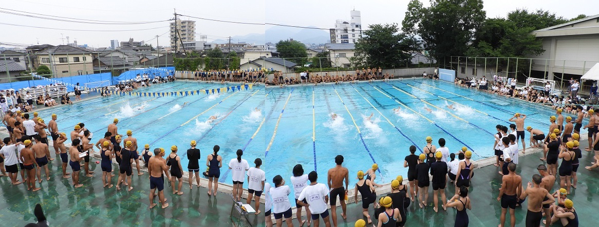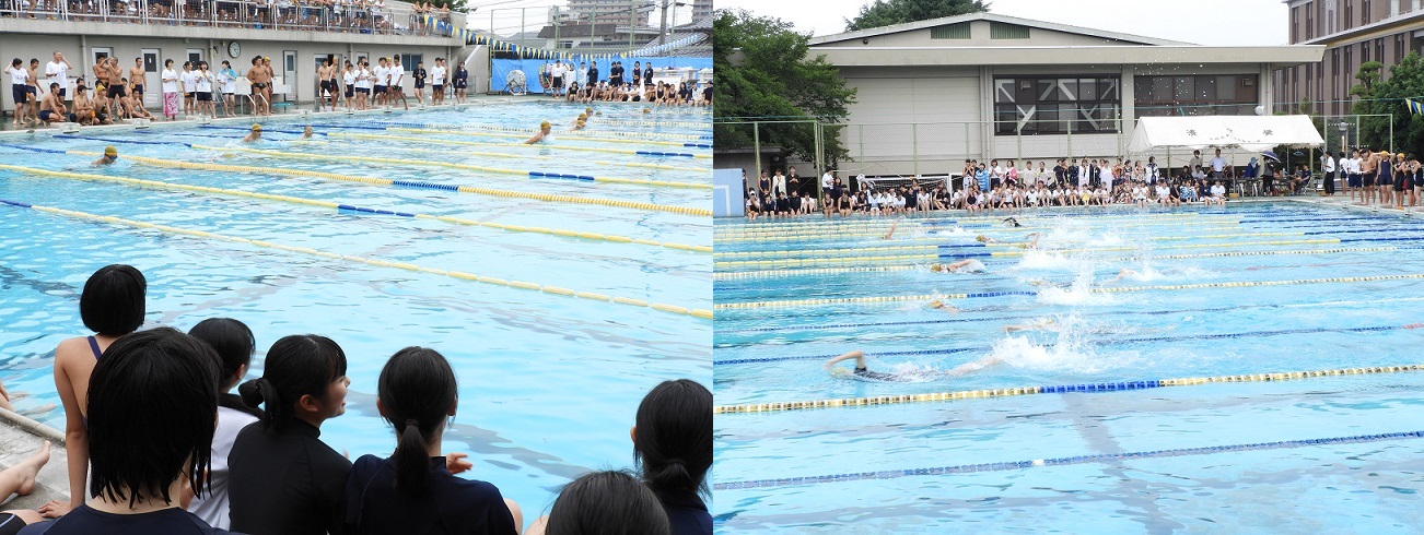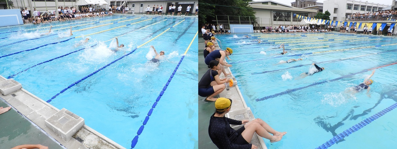 7月5日(金)午後、本校プールで2年生のクラスマッチ、水泳競技大会が行われました。蒸し暑さの中での水泳競技とあって、気持ちよさそうに、飛び跳ねるような泳ぎで競い合っていました。4日に開催された1年生のクラスマッチと同様、男女で11種目の泳ぎを競い、心ひとつになった団結の大声援のなか最後はクラス対抗リレーで終了。1位は10組、2位は9組、3位は6組でした。2年生の心意気に天気も持ち堪えてくれたようです。お疲れ様でした。