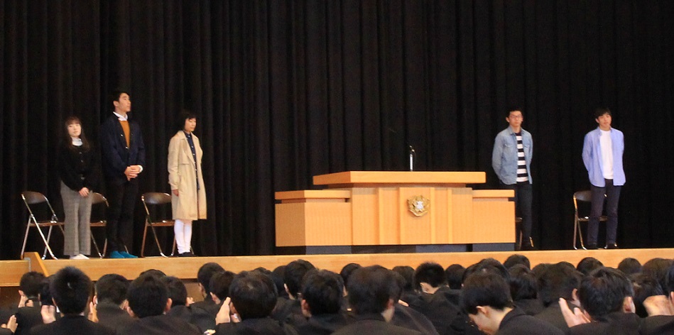 桜の花やチューリップが咲き始め、本格的な春の訪れに心も踊るなか、終業式を迎えました。校長訓話では、「いよいよ仕上げの年を迎える2年生、これから中核を担う1年生へ、自覚を持って新学期を迎えてくれることを期待している。同窓生や地域の方の支えや期待の大きさを感じ、それに応えるべく、自分に何が出来るか、出来ることをやって一歩踏み出してほしい。」と述べられました。引き続き行われた合格者体験談では、池上さん(大阪大学外国語学部)、古閑さん(大阪市立大商学部)、濱田さん(九州大学農学部)、竹田さん(熊本大学医学部医学科)、久家さん(京都大学理学部)が高校生活を振り返り、目標設定の時期や勉強への向き合い方などについて語るとともに、在校生へエールを送りました。