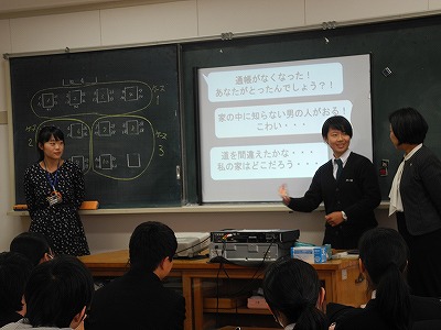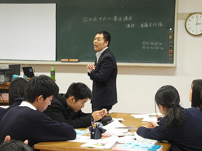 2月22日(金)から3月20日(水)まで、1年生の家庭基礎の授業の中で認知症サポーター養成講座を行いました。講師は、ささえりあ浄行寺の方、熊本大学 安武綾先生などに担当して頂きました。DVD・グループワーク・ロールプレイなどを通して認知症について深く学ぶことが出来ました。生徒達は、「認知症の患者の方の不安などを取り除くために、ちゃんと寄り添っていきたい」「受講前は、認知症と聞くとマイナスなイメージばかり思いうかんだけど受講して介護する側や地域の人々の接し方次第で楽しく安全に暮らせることがわかった」「本人の苦しみは分け合うことで軽くなるものなので、支え合えるシステムと理解が大切だと思った」などの感想を述べていました。講師の先生方、ありがとうございました。
