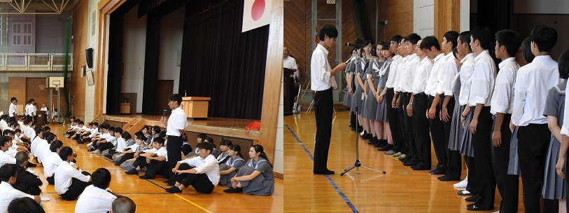 今月下旬から始まる総文祭・総体の推戴式が行われました。参加する各部・同好会の主将・部長が抱負を述べたあと、黌長・生徒代表の激励のことば、選手代表(漕艇部・栗林主将)の宣誓、黌旗の授与、応援団の必勝の拍手とエールと続き、最後に全員で三綱領唱和・黌歌斉唱を行ってお互いの健闘を誓い合いました。