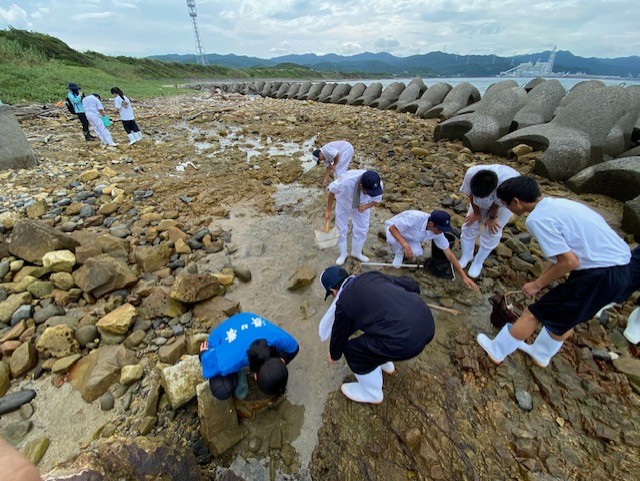7月13日(日)に、天草拓心高校マリン校舎において、本黌の生徒とマリン校舎の生徒が一緒になって、探究活動を行いました。午前中は、マリン校舎の養殖施設の見学を行った後、磯での生物採取を行いました。エビやカニだけでなく、ハゼの捕獲にもチャレンジしました。午後は、教室において、海の生き物についての情報交換や意見交流を行いました。お互い、最初は緊張していましたが、「海の生き物」という共通の話題によって次第に打ち解け、深い探究活動になりました。