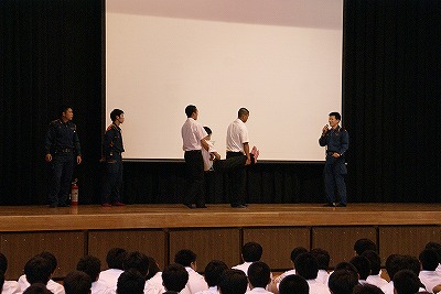 避難の様子を見ていただいた中央消防署の職員の方から、「災害があっても時間が経つと記憶が薄れてくる。地震の備えについて、また、防災に関して日頃から家庭で話題にしてほしい。」というお話をいただきました。さらに、負傷者搬送方法の実演や消火器の使用法の解説もしていただきました。