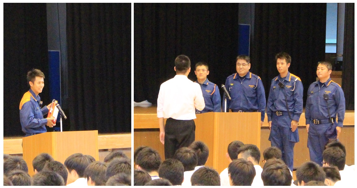 地震そして火災発生に対する避難訓練を、生徒に事前連絡をせずに行いました。校内放送も使えない状況を想定し、避難指示は職員の人海戦術で行われました。生徒への事前連絡はありませんでしたが、混乱・混雑等なく体育館に無事集合することができました。熊本市中央消防署から来られた職員の方からは、①防災ポイント「頭を守る・ハンカチを口に当てる・姿勢を低くする」、②消火器の特徴と使い方について助言をいただきました。「消火剤の飛距離は5m、使用時間は15秒間。」「消火器の使い方はピノキオ。ピ『ピンを抜く』ノ『ノズルをはずす』キ『気合いを入れて構え』オ『押す(レバーを)』」と、わかりやすく説明がありました。今や心配なのは自然災害だけではありません。いつどこで何が起こるかわからないからこそ、日頃から防災を意識した行動を心掛けましょう。