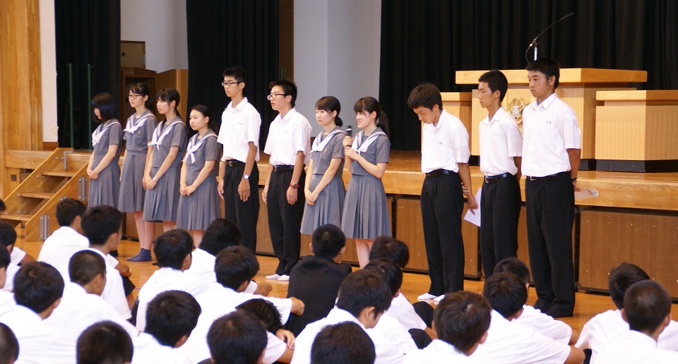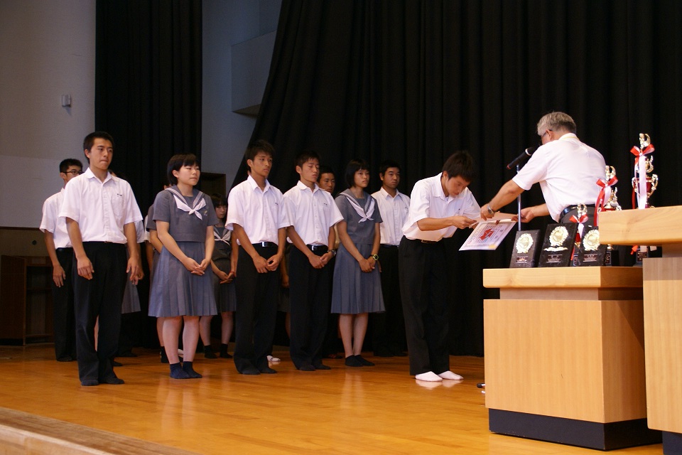 梅雨明けが宣言された本日、1学期の終業式を迎えました。まず総体・総文等における生徒たちの活躍を表彰したのち、全国大会に出場する生徒に向けて壮行会を行いました。黌長による激励の言葉では、県代表としての誇り・自覚・感謝の気持ちを持って残りの練習に臨み、大会を楽しんでほしいとの話がありました。なお、名誉なことに、本黌陸上競技部の田中君が本県選手団の旗手を務めます。