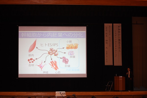東京工業大学生命理工学院准教授で、本校OBでもあられる白木先生の体験や経験を通した多くのお話しを聴くことができました。ES細胞や、iPS細胞など最先端の再生医療に関わる研究の話や、ご自身の学生時代の話など、様々な角度から「学び」方について考えさせられる時間だったと感じました。