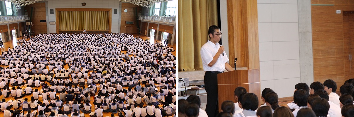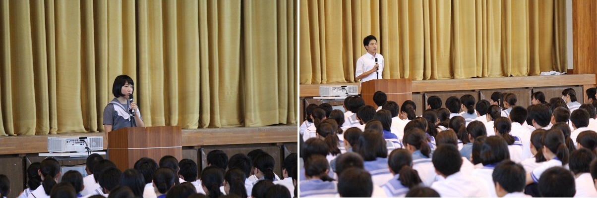 中学生に、済々黌高校の様子を知ってもらう機会として、生徒会が中心となり進行しました。弦楽部の歓迎演奏に始まり、放送部による映像を用いたプレゼン、在校生による高校生活の話、最後に応援団と有志による演舞など、学校の雰囲気を感じてくれたのではないでしょうか。在校生による話では、各学年を代表して3名の生徒が学校生活や家庭での学習について話ました。中学生の今後の進路選択に役立てて欲しいと思います。