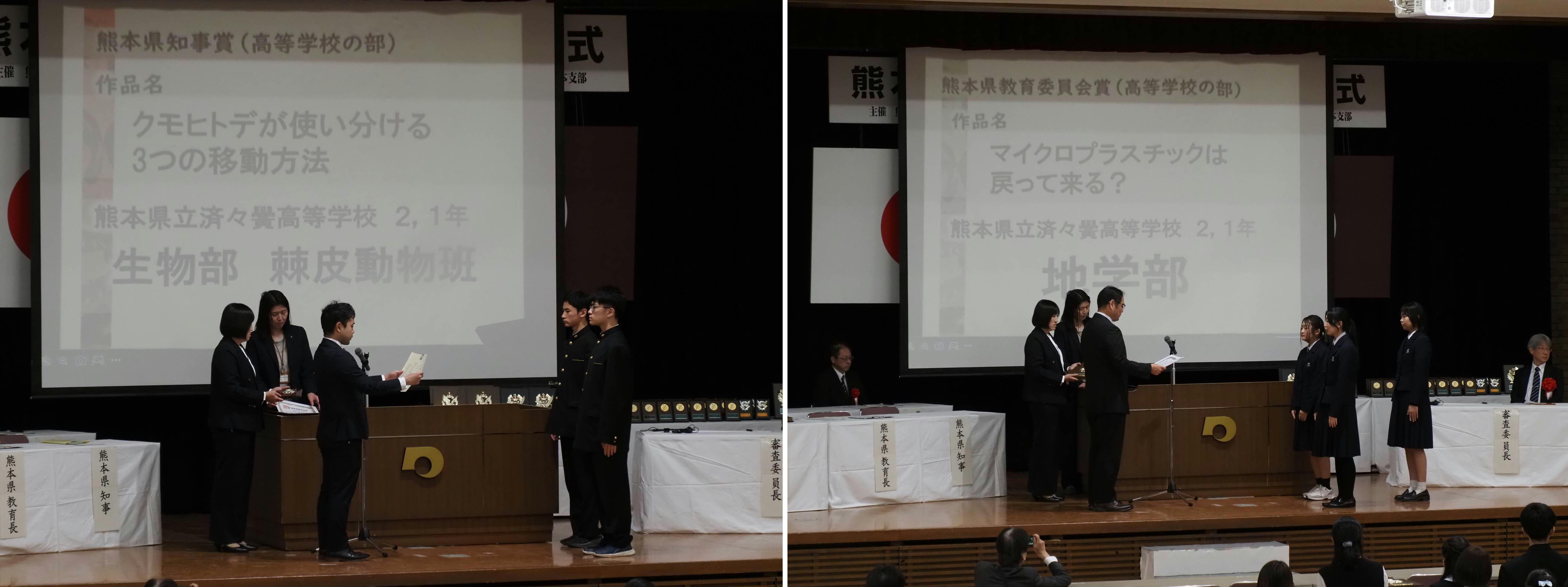 第85回熊本県科学研究物展示会(科学展)の表彰式が2025年11月26日、熊本県庁で行われ、生物部棘皮動物班がグランプリの熊本県知事賞、地学部が2位の熊本県教育委員会賞を受賞しました。