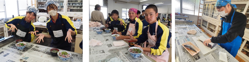 初めて魚を捌く生徒が多かったのですが、自分で作った鯵丼は格別に美味しかったようです。森さんは、「肉料理だけでなく、魚料理にも関心をもってどんどん食べてほしい」「魚を1尾で買うことはなくても、切り身の魚を買って料理ができる人になってほしい。これを機に魚料理を気軽に楽しんでもらえれば嬉しい。」と話されていました。