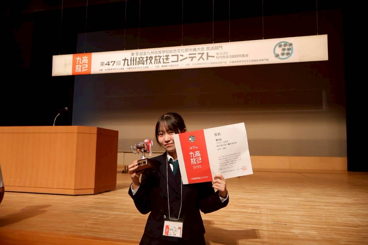 審査の結果、アナウンス部門で山村さんが3位に入賞しました。山本さんは優良賞でした。本校生のアナウンス部門での入賞は初めてのことです。山村さんは、第50回全国高等学校総合文化祭(あきた総文祭2026)放送部門(アナウンス)に推薦されました。