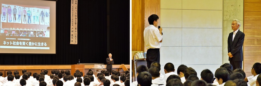 熊本地震に見る、SNSやインターネットの功罪の例を皮切りに、ネット社会を生き抜く上で必要な力についてお話いただきました。講話では中高生のSNSの文面やLINEのルールが紹介され、生徒たちにざわめきが起こる一幕もありました。現代の情報機器は便利な反面、人間の想像力を失わせかねず、見知らぬ危険と接しやすい状況をも生んでいること、また見知った相手ともその非対面コミュニケーションで削ぎ落とされていく情報に留意すべきであり、今ネット上にある人類の財産としての膨大な情報を活用するために、論理の力をこの済々黌で学んでほしいということが述べられました。お話を受けて、3年2組の山内健輔くんが、3つの基盤力(表現力・コミュニケーション力・想像力)と4つの知識(フィルタリングの必要性・ネットに匿名性は無いこと・ネットは公共物であること・手軽だからといって軽々しい行為をしないこと)を心に銘じ、今後の生活に活かしていきたいと謝辞を述べました。