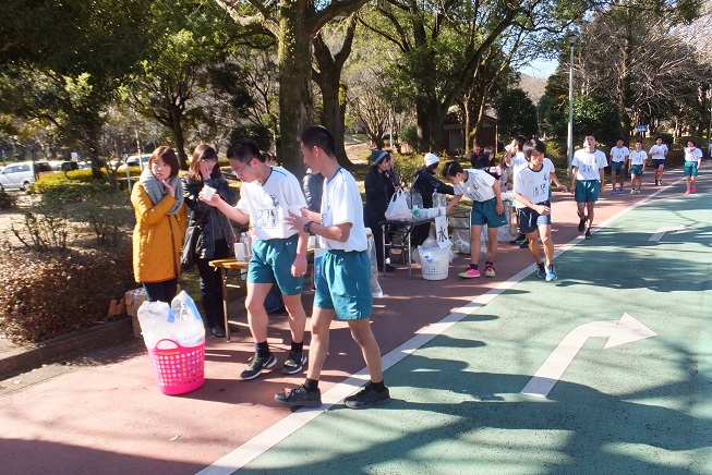 部活動委員12名と、西口会長、北里副会長、江田3学年委員長、松崎1学年委員長、高須進路支援委員長、松野広報委員長、また、1・2年のクラス評議員13名の皆様にも御協力いただきながら、中間地点においてのポカリスエットと水の2種類の給水、ゴールでのポカリスエットの給水、そして大きな声援を送りました。