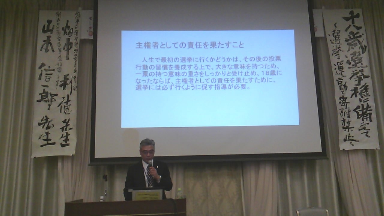 今回の講演では、昨年6月に改正された公職選挙法における学校及び保護者の対応について、細かく説明して頂きました。我々大人も知らなかった公職選挙法の基本的なことについても教えて頂き、子ども達に説明する際に大変役立つ講演会でした。