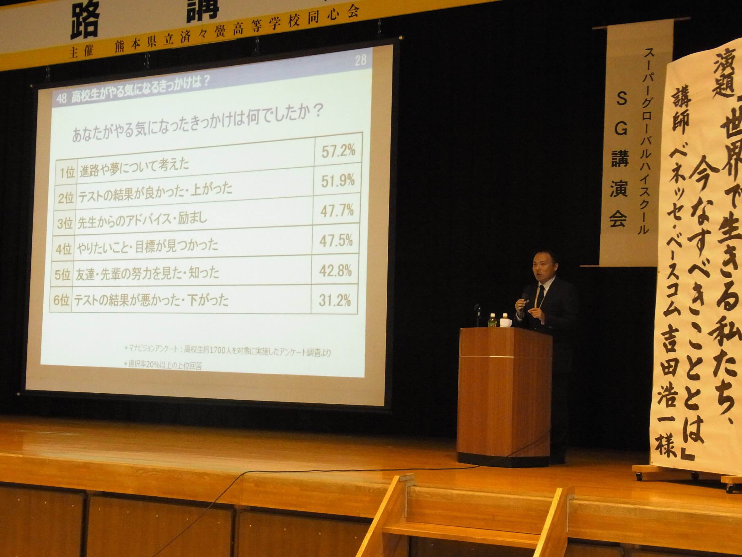 講演会では、株式会社ベネッセ・ベースコムの吉田浩一様から有意義なお話をお聴きすることが出来ました。生徒の皆さんはいろいろな場面で耳にしたこともある話もあったかもしれませんが、吉田様ご本人も高校生の子どもを持つ親ということで、その立場からの話も興味深く、また楽しく聞かせて頂きました。